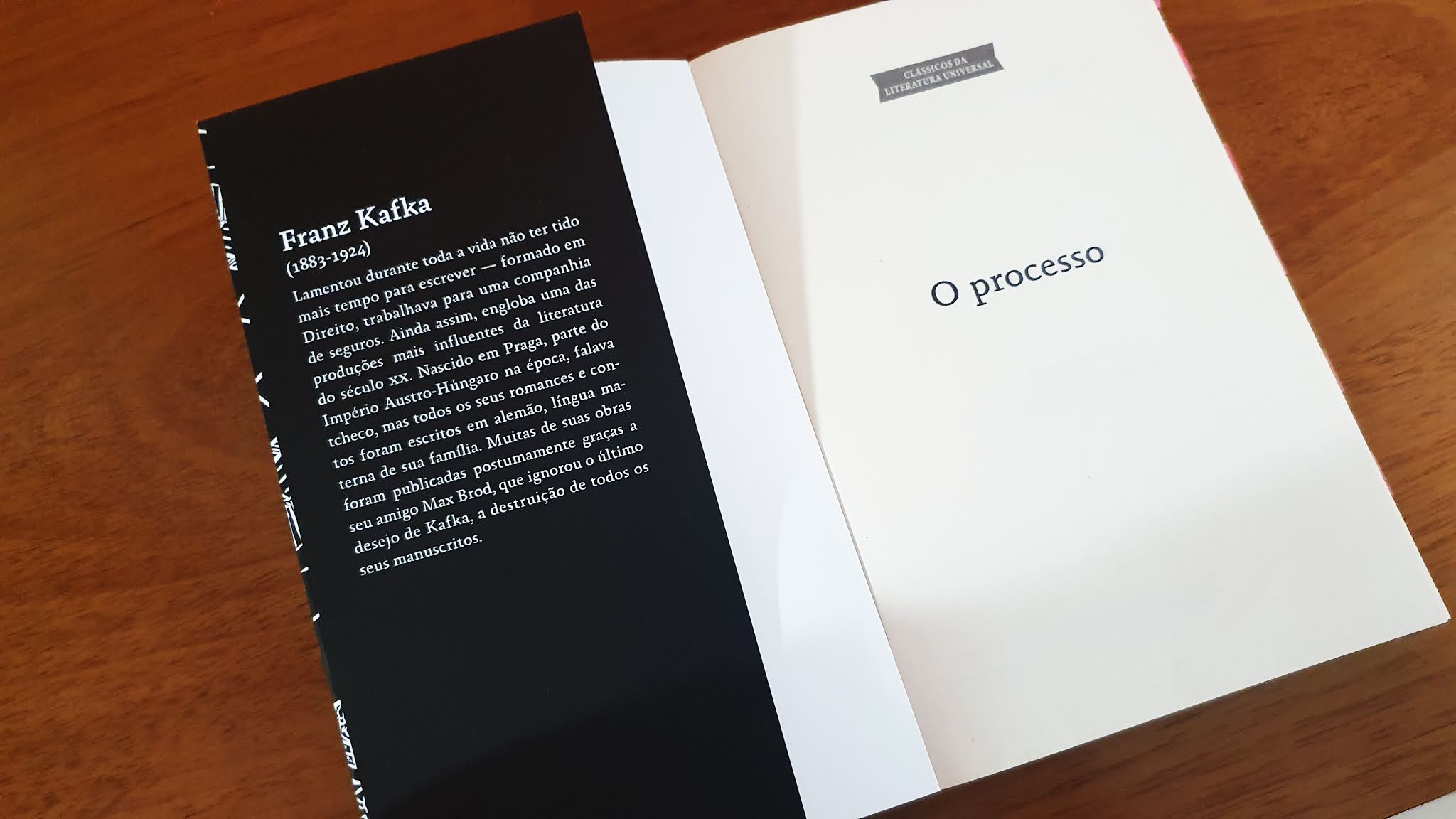 Sinopse: Um dos principais romances de Franz Kafka, O processo foi publicado pela primeira vez em 1925, ano seguinte à morte do autor. A obra foi editada por Max Brod, que foi guardião dos manuscritos do escritor tcheco por intermédio de seu testamento. Neste livro, Kafka lança o leitor mais uma vez em uma realidade absurda, na qual um bancário se vê envolvido em um processo judicial inexplicável. Em seu aniversário de 30 anos, Josef K. é surpreendido por dois guardas logo que acorda. Após os homens tomarem o café que deveria ser dele, comunicam-no que está preso, embora não lhe deem motivo algum para isso. Sem saber quem o denunciou nem o motivo de sua prisão, ele luta contra autoridades que o ameaçam e o chantageiam, embora nunca apresentem o embasamento legal da investigação. O processo, ao lado de A metamorfose, é uma demonstração inequívoca da potência literária de Franz Kafka. Um romance que não soa datado mesmo um século depois de sua publicação original.